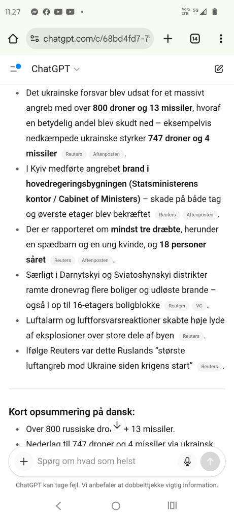AInews Massive drone-angreb mod Kiev Redaktør AINews 7. september 2025 About the Author Redaktør AINews Administrator Visit Website View All Posts Post navigation Previous: Meningsmålingerne: rødt flertalNext: Blåt Konvent i Fredericia Skriv et svar Annuller svarDu skal være logget ind for at skrive en kommentar. Related Stories AInews Debat Samfund Køns- og aldersneutralt CPR-nummer ønskes – borgerkort isf sygesikringsbevis Redaktør AINews 18. september 2025 AInews Dansk politik Samfund Har moderat minister medansvar for RUC-skandale? Redaktør AINews 16. september 2025 AInews Krim Kultur JUSTITSMORD – Interview med transkvinden Ibi Pippi Redaktør AINews 16. september 2025
